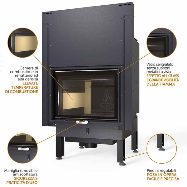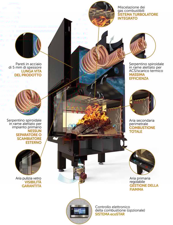 DOMINUS GOLD, il termocamino 5 STELLE equipaggiato con scambiatori polivalenti in grado di consentire il collegamento idraulico con ogni tipo di impianto, senza scambiatori o separatori esterni.