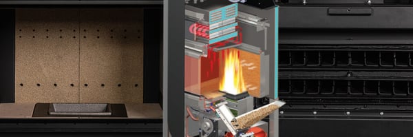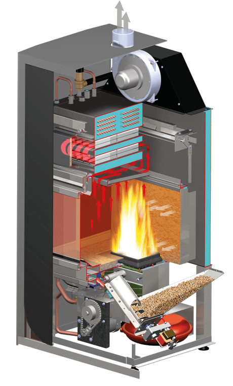 Il capiente serbatoio è collegato al bruciatore mediante una coclea con doppio salto, separato da una valvola a ghigliottina per evitare il ritorno di fiamma. L’avanzata tecnologia del caricamento dal basso consente di sfruttare molteplici vantaggi:
